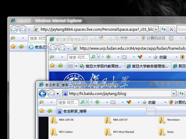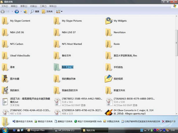 昨天晚上搞到3点多,把XP搞成VISTA的样子了~我的电脑配置实在太烂,显卡只有FX5200,三条渲染管线只有一条支持DX9c~内存么512M DDR实在也勉强~所以只能在视觉上享受VISTA了~~用的是WB版的VistaCHS color主题,加上VISTA默认风格的指针和登陆界面,还有微软雅黑字体~先贴点截图吧~~文件夹视图