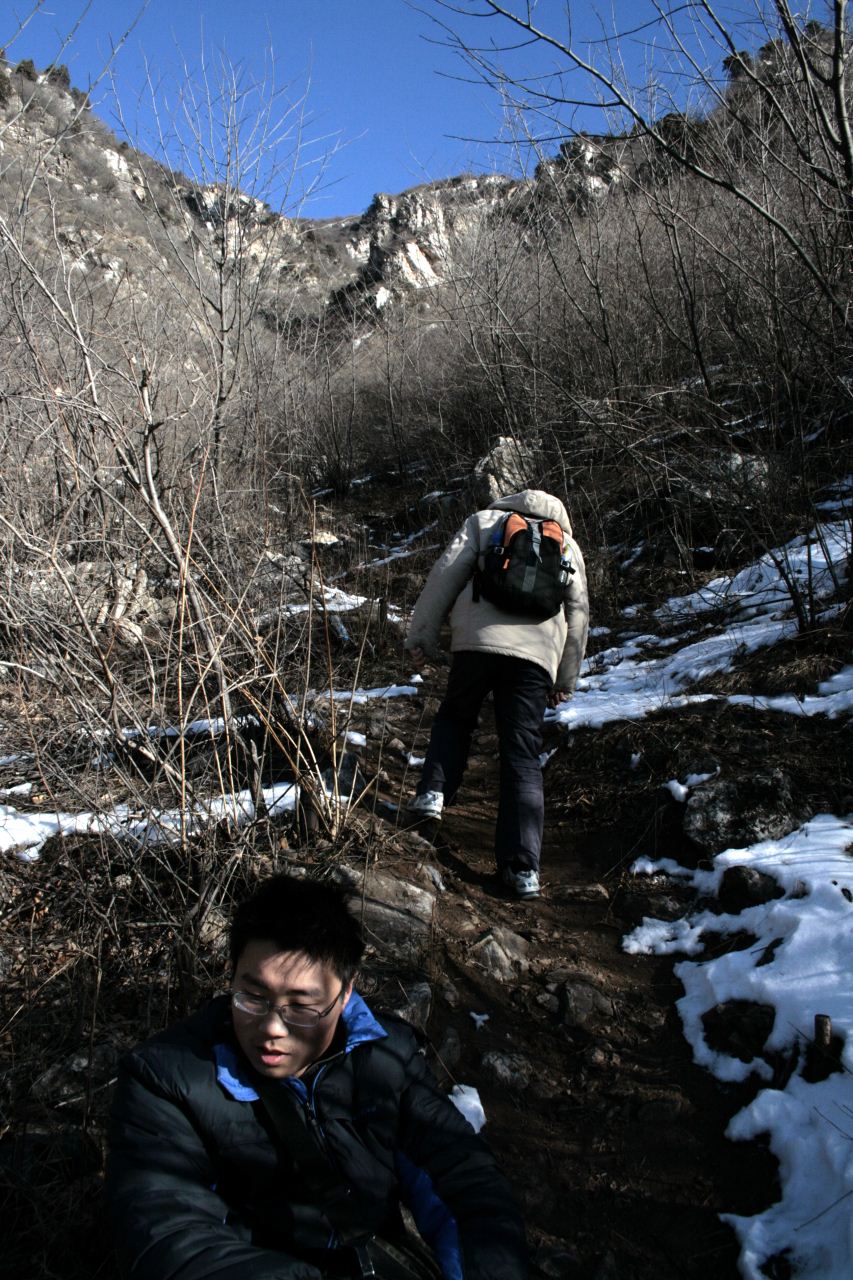 下山的路原来是一条小溪,现在怀柔这块地方的水都被虹鳟鱼给榨干了,这小溪自然也干了。但是这路也不好走,小溪里的乱石极其松动,无法着力,稳固地石头又被磨地异常光滑,我的AF25在这种条件下显然是杯具。上山的时候漆皮就挂了,下山的时候又毫无抓地力,只能放大招,手脚并用滑下去。原来很萎靡的包包在下山的时候突然就兴奋了,跟着大波跑没影了,我跟着大部队的中部人马,走走摔摔,后面的人都跟我说了,这鞋不行。。。