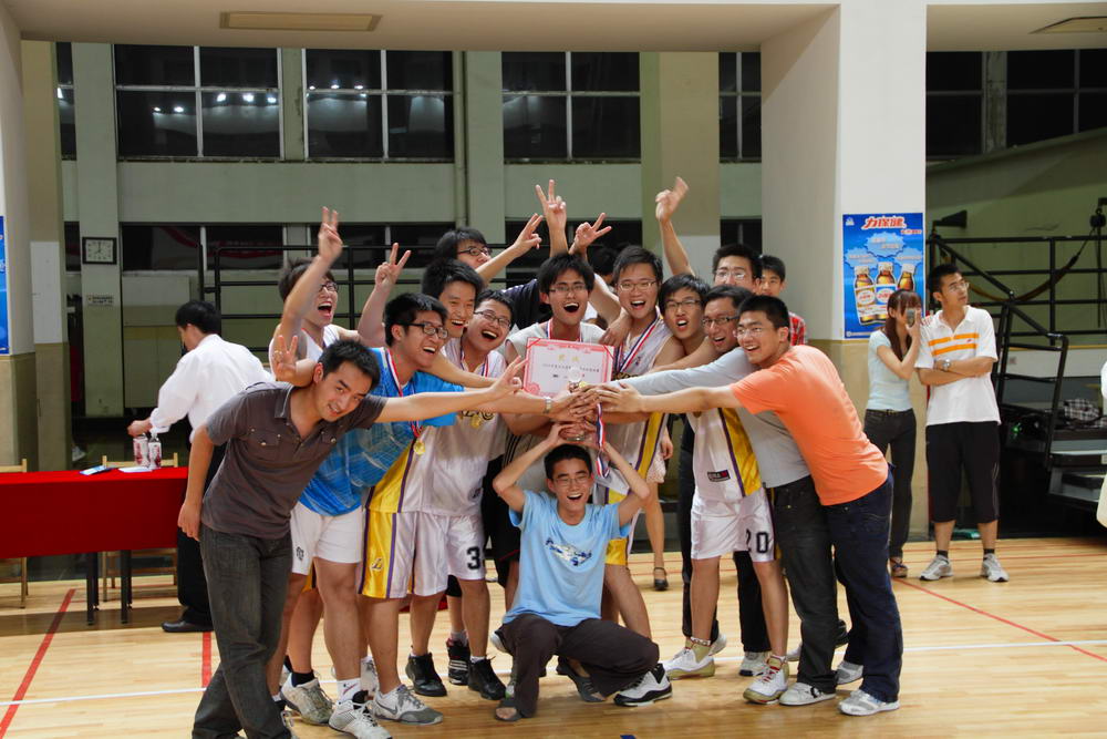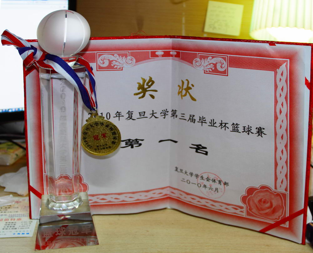 我们专业一路凯歌勇夺了毕业杯冠军。在信院内部比赛拿冠军拿腻了之后,我们果断出手拿了个校际比赛的冠军。今天的对手新闻学院应该说是我们一路上遇到的对手中最强的了,虽然过程比较坎坷,但这样拿一个冠军感觉要比虐环科这样的烂队感觉要好得多。只是我一个干净的帽被吹了犯规,一个断球快攻上篮被吹了对方24秒违例让我觉得有一丝不爽。最后的奖品是一大箱力保健,真是啥赞助商就送啥,我觉得着毕业杯以后不能再让力保健冠名了,应该叫THINKPAD,CANON,或者法拉利兰博基尼宾利来赞助。。。